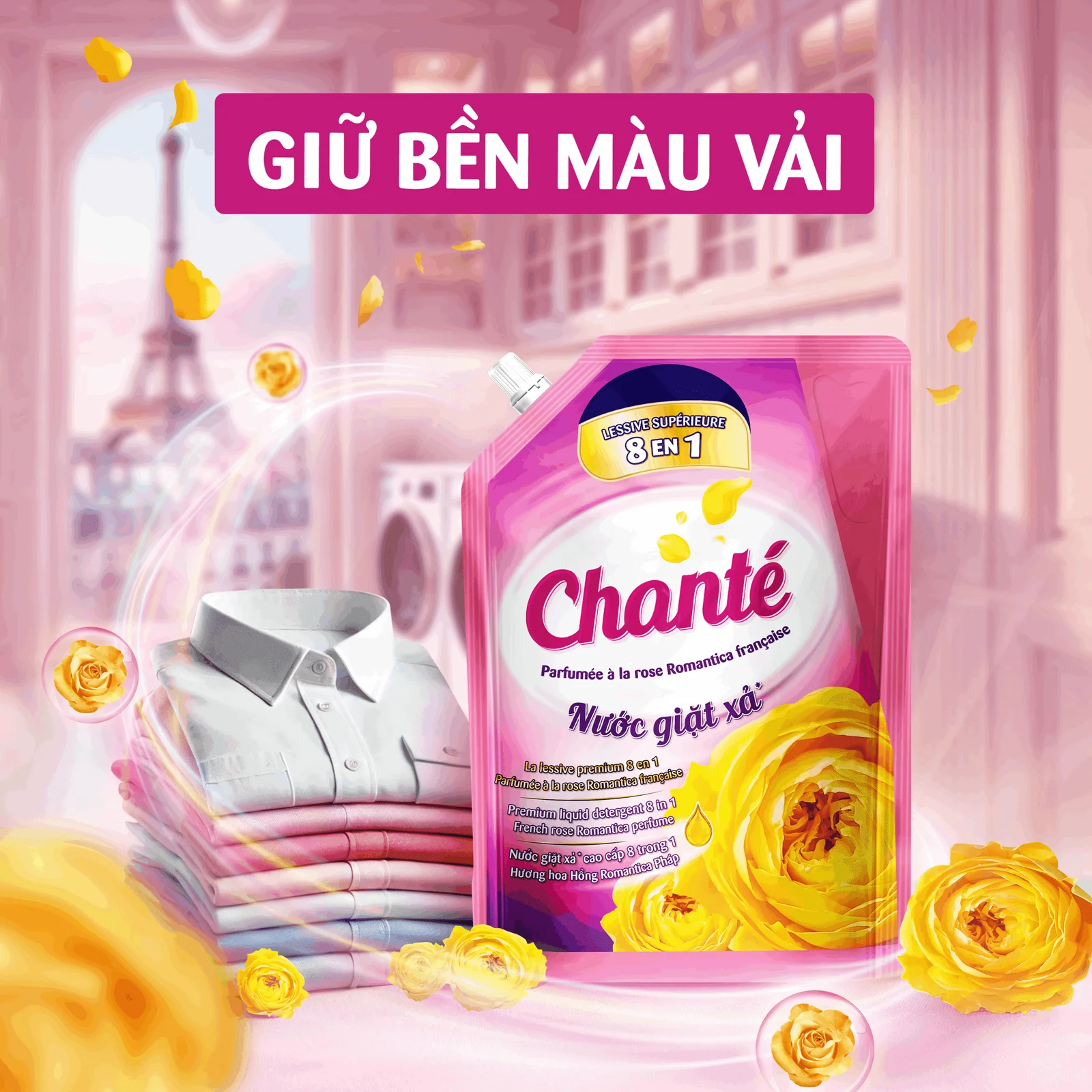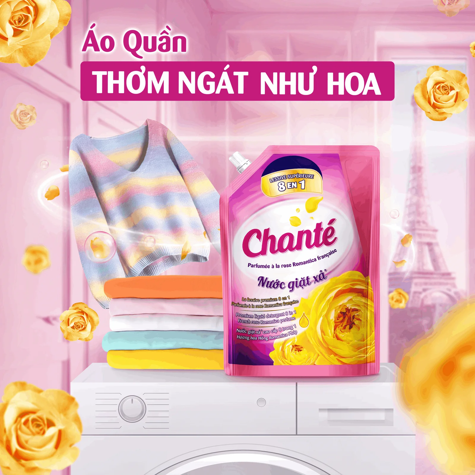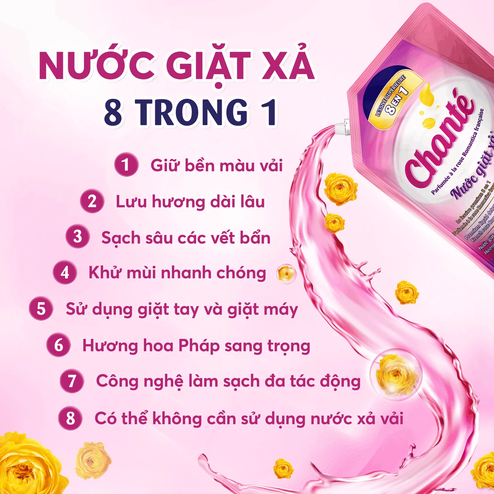 Nước giặt xả cao cấp 8 trong 1 Chanté hương hoa Hồng Pháp với hương thơm sang trọng, lôi cuốn từ 100% thành phần tinh dầu hoa Hồng Pháp. Mang đến cho bạn trải nghiệm giặt giũ đa công năng: sạch như mới, lưu hương dài lâu và bung tỏa hương mỗi khi vận động.