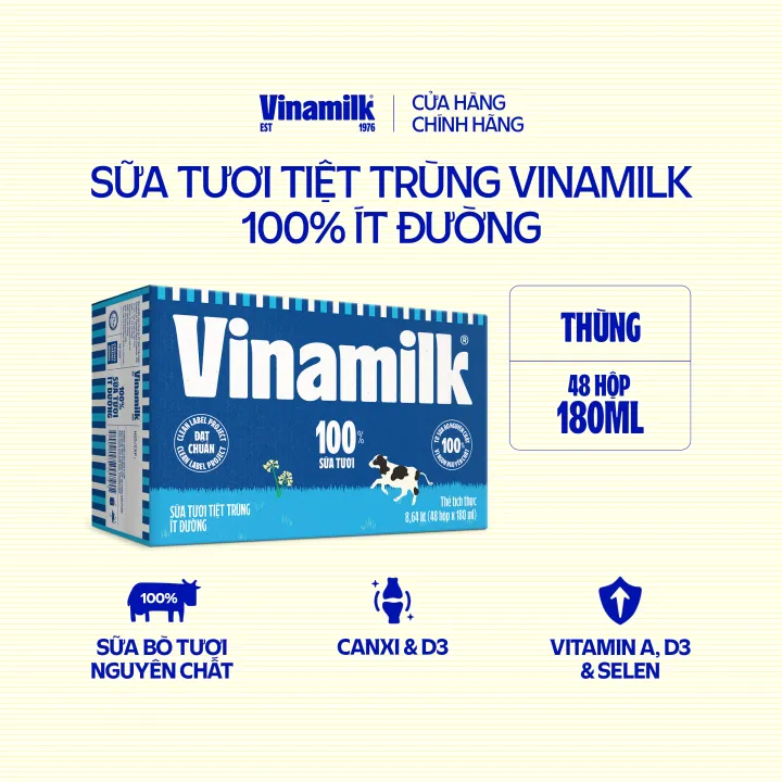 Được làm từ 100% sữa bò tươi nguyên chất từ những nông trại rộng lớn trải dài khắp Việt Nam, giàu các dưỡng chất tự nhiên, tươi ngon & bổ dưỡng.